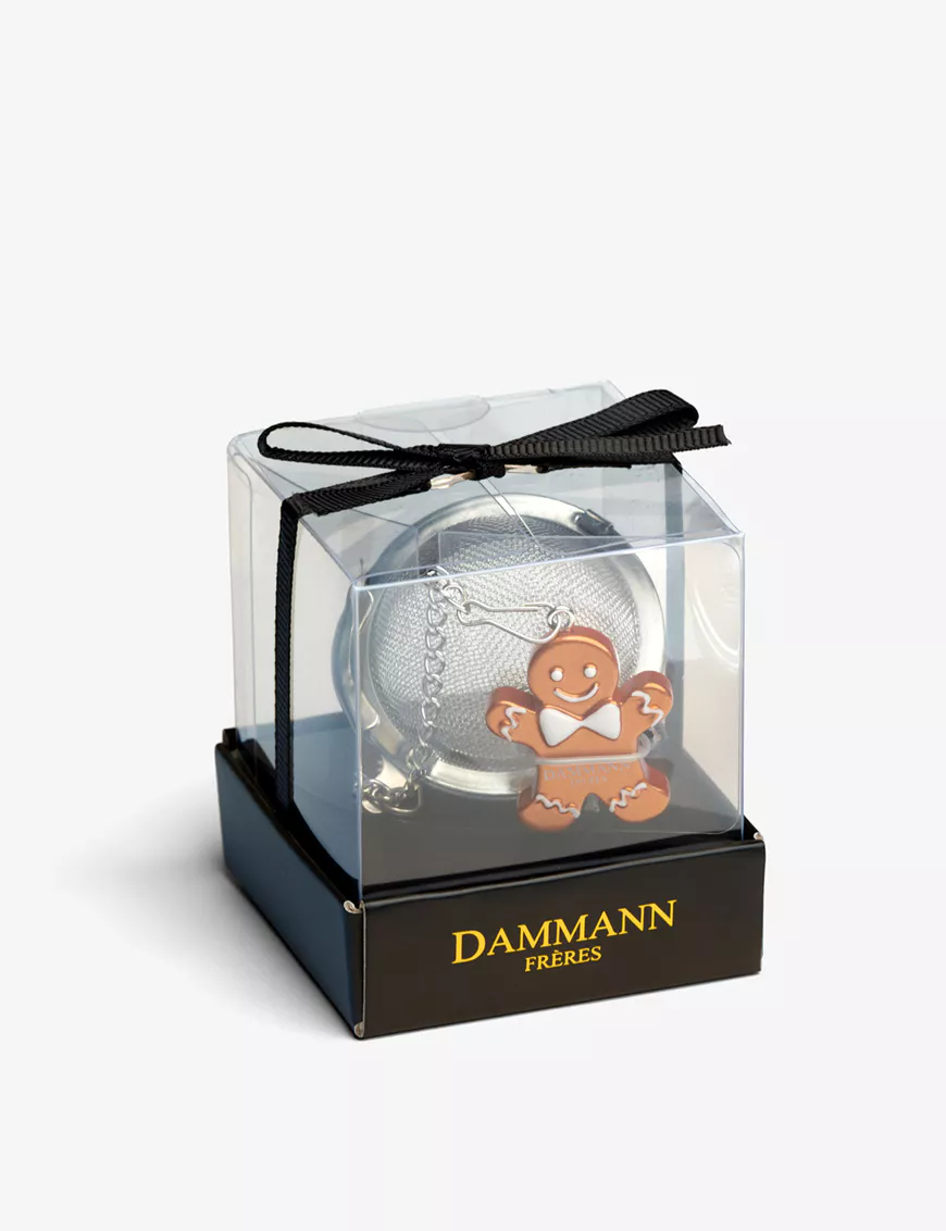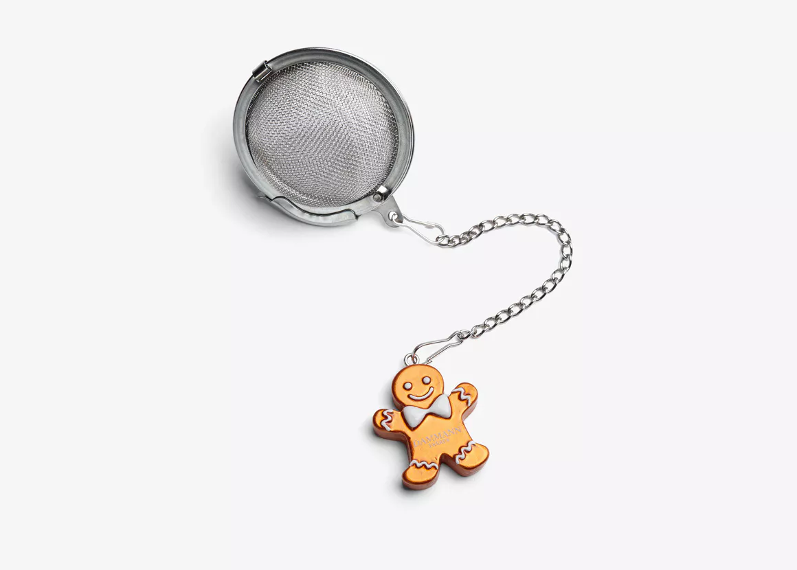 L’élément qui la distingue véritablement est sa figurine en résine représentant un bonhomme de pain d’épices, fixée au bout de la chaîne. Ce petit personnage, symbole de douceur et de convivialité, apporte une touche festive et ludique à chaque préparation. Sa fonction n’est pas seulement décorative : il permet également de manipuler la boule facilement, que ce soit pour la placer dans la tasse, la retirer après infusion ou la déposer proprement sur une soucoupe.